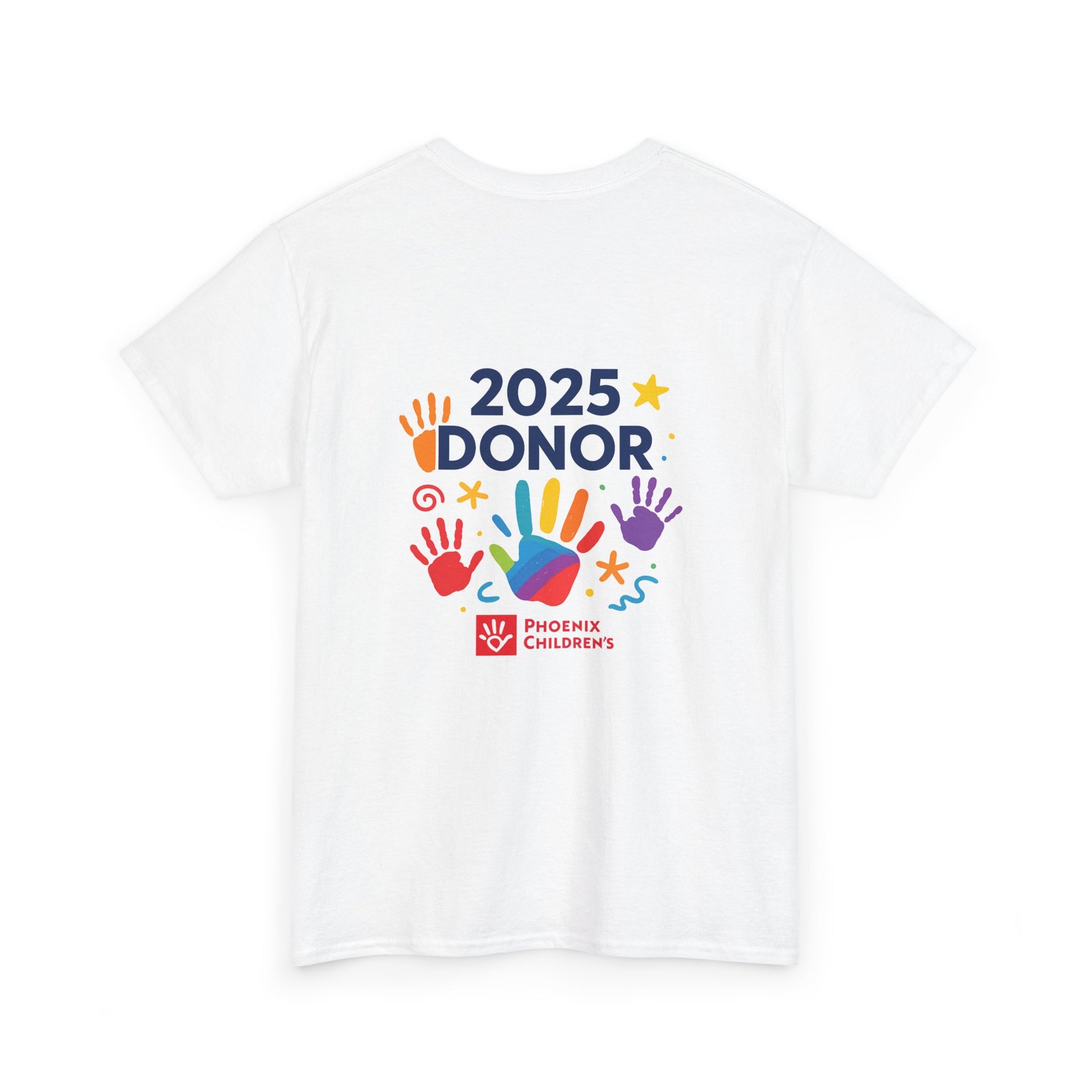 Crafted from soft, sustainably sourced cotton, this tee provides a cozy feel and relaxed fit, making it ideal for everyday wear, events, or special occasions. With its classic crew neckline and clean, durable construction, it transitions seamlessly from casual outings to community gatherings. The bold 2025 donor design featured prominently makes a statement that you stand behind the mission of AZ Kidz Experience.